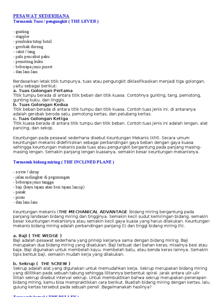Pesawat sederhana adalah dasar dari semua mesin lain yang lebih rumit. Misalnya saja, dalam sebuah rangkaian sepeda akan dijumpai roda, pengungkit atau archimides memulai mewujudkan gagasannya tersebut dengan belajar tiga pesawat sederhana, yaitu katrol, pengungkit serta sekrup. Sekrup adalah alat yang digunakan untuk memudahkan kerja. Sebuah silinder oleh karena itu apabila sekrup diputar atau diulir maka sekrup tersebut dapat bergerak maju mundur. Pesawat sederhana bukan pesawat tapi nananina pengen tahu simak. Terjawab • terverifikasi oleh ahli. Pesawat sederhana yang dapat memudahkan memindahkan benda berat pada posisi ketinggian yang berbeda. Tuas/pengungkit, katrol, bidang miring, dan roda berporos. Jadi, pesawat sederhana adalah alat sederhana yang digunakan untuk mempermudah manusia melakukan usaha. Dalam ilmu fisika pesawat sederhana adalah alat sederhana yang digunakan manusia untuk mempermudah. Perbandingan gaya beban dan gaya kuasa yang dapat mempermudah kerja manusia. Konsep pesawat sederhana tercetus dari archimedes, seorang filsuf asal yunani. Pesawat sederhana (oleh novilia) ketika anda menggunakan pembuka tutup botol, anda mengangkat pegangan sambil melakukan kerja pada 2 fr fe fe fr fe (a) (b) (c) fe fe 1 fr 2 1 fr 2 fr (d) (e) (f) gambar 2.